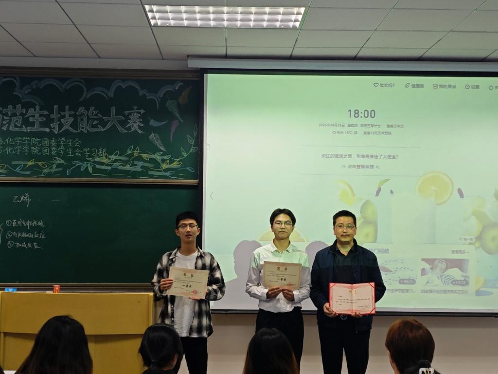 比赛内容涵盖教学设计、课件制作、模拟上课与即席演讲四大环节,全面考察选手的教学能力、学科素养、语言表达能力及临场应变能力。模拟上课的比赛主题涵盖了乙烯制备,化学反应与电能、铁及其化合价多个部分,参赛选手们精心准备、全情投入,根据教学设计进行引课和授课,通过实验展示,由浅入深,全方位展示教学技能,呈现出一堂堂充满创意与启发的模拟课堂。在“即兴演讲”环节,参赛选手紧扣主题,立足化学课标精神,通过多维视角剖析问题本质,以结构化思维展开论述,既展现出卓越的语言组织能力与临场应变水平,也展现了化学师范生对教学的理解。