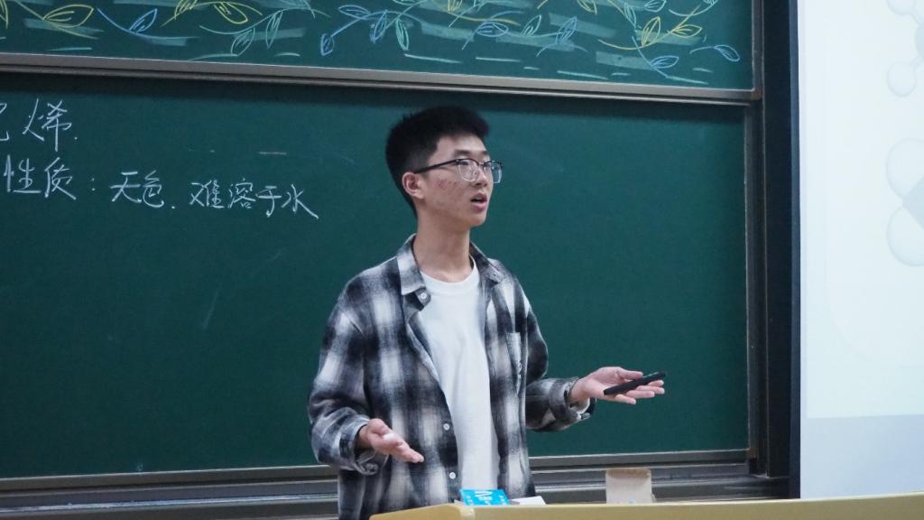 在本次比赛中,来自化学师范专业的李俊琦同学表现尤为出色。他在模拟授课环节以乙烯的性质为题,通过巧妙的教学设计、生动的语言表达和精彩的实验演示,充分调动了“课堂”氛围,展现出扎实的专业知识和出色的教学组织能力,赢得了评委的一致好评。
