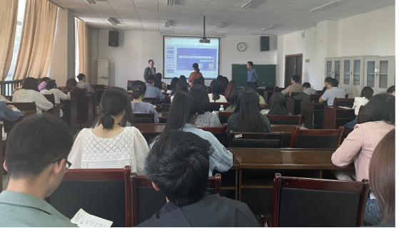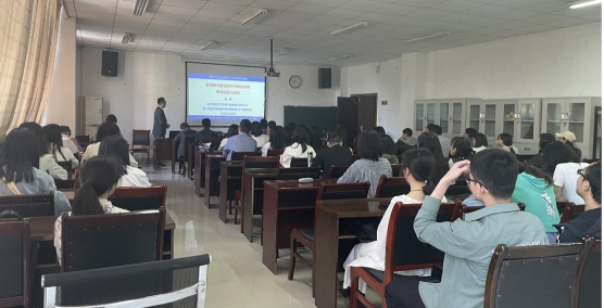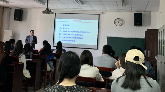 王燚教授为大家介绍了董帆教授。完毕,从同学们的一阵阵掌声中感受到了对董帆教授的热情和该报告的期待。接着,董帆教授正式开始给大家做“半导体光催化材料与反应机理研究进展与挑战”的学术报告。该报告依次从六个方面来介绍的,它们分别是:研究背景,研究方法,光催化氧化去除NO的反应机理及应用,光催化分解VOCs的开环机制,光催化还原CO2制取太阳染料以及存在的问题和挑战。