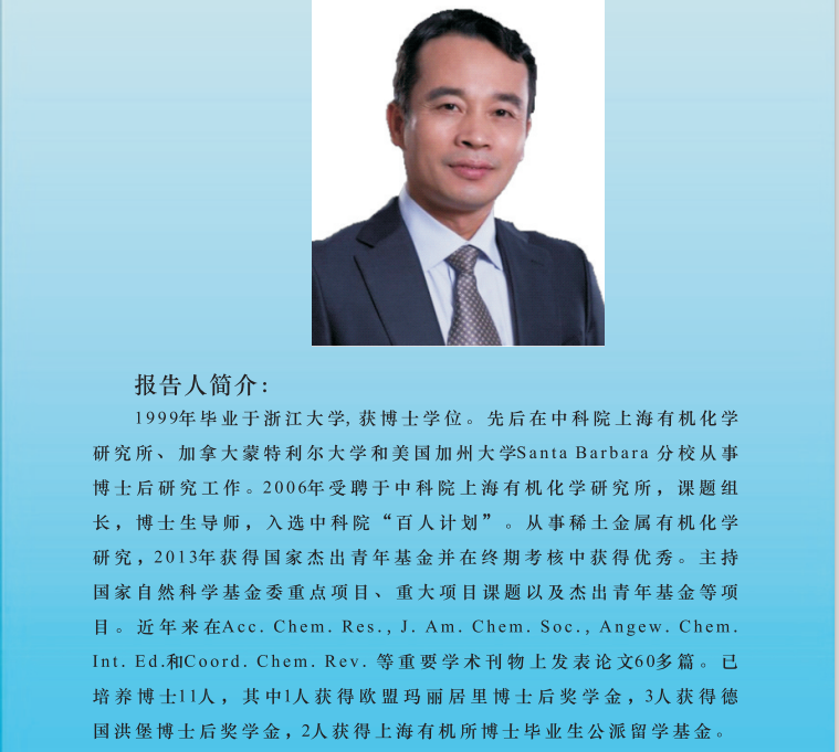 陈耀峰,1999年毕业于浙江大学,获博士学位。先后在中科院上海有机化学研究所、加拿大蒙特利尔大学和美国加州大学Santa Barbara分校从事博士后研究工作。2006年受聘于中科院上海有机化学研究所,课题组长,博士生导师,入选中科院“百人计划”。从事稀土金属有机化学研究,2013年获得国家杰出青年基金并在终期考核中获得优秀。主持国家白然科学基金委重点项目、重大项目课题以及杰出青年基金等项目。近年来在Acc. Chem. Rcs., J. Am. Chem. Soc., Angcw. Chem.Int. Ed和Coord. Chem. Rev. 等重要学术刊物上发表论文60多篇。已培养博士11人,其中1人获得欧盟玛丽居里博士后奖学金,3人获得德国洪堡博士后奖学金,2人获得上海有机所博士毕业生公派留学基金。