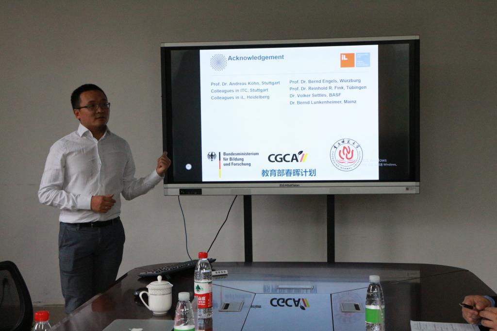 活动开始后,刘文斓老师上台作开场发言,他详细的介绍了留德华人化学化工学会。第一个上场做学术讲解的是李蒙蒙老师,他主讲有机方面,分子自组装在有机电子学中的运用;而后是胡连哲老师,他的讲述领域是纳米化学,讲述了可调控的纳米酶催化体系及其在分子识别与传感中的应用;贾国彬老师向大家清晰的介绍了他在能源方面的研究成果,其中重点讲述了激光晶化多晶硅薄膜太阳能电池。在学术交流过程中,每位老师讲完都设有答疑环节,前言的学术知识,精彩的学识精华,引得片片掌声争相回应。龙榕老师就她在博士及博士后期间所做出的成果进行了讲解,刘文斓老师重点讲述对密度泛函对共轭聚集体系的电子激发态与电荷迁移耦合常数的描述的评估。
