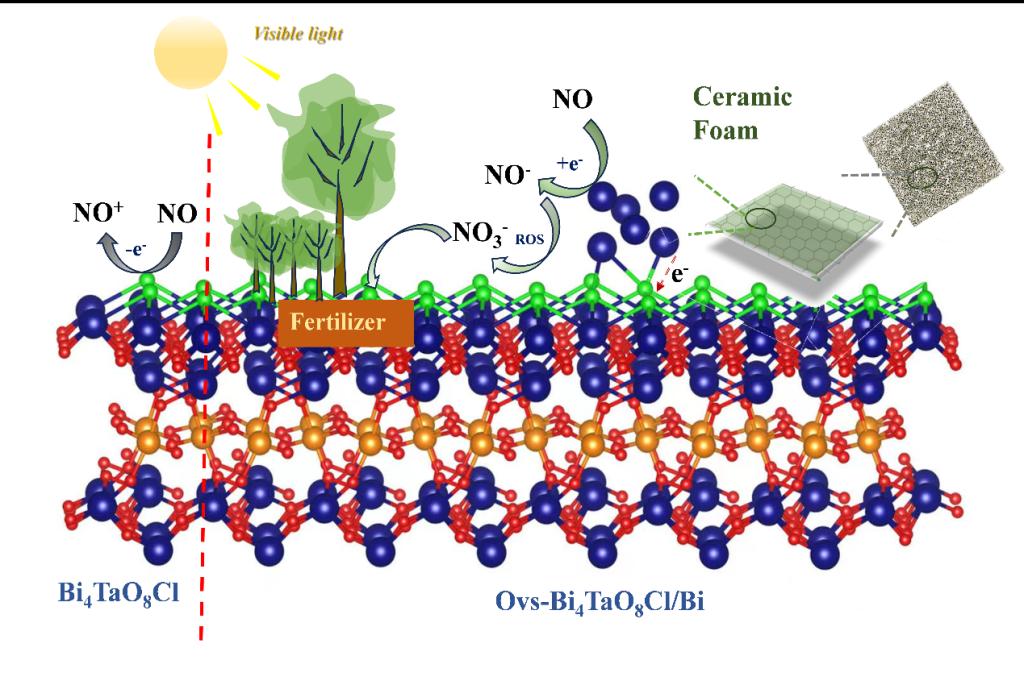 为了解决这一关键科学问题,通过在Bi4TaO8Cl的表面原位构筑Bi单质和氧缺陷设计合成了高性能环保材料及器件。该研究采用原位手段揭示了NO+和NO-离子对光催化氧化NO的反应路径影响,为污染分子净化路径的调控提供良好借鉴。重要的是,该材料及器件在室温下对环境污染物表现出了高效的净化效果:一是对空气中的一氧化氮(NO,浓度为600ppb)去除率高达89%,有效抑制了二次污染物二氧化氮(NO2)的生成,同时表现出良好的稳定性;二是对致癌空气污染物甲醛(浓度为60ppm)的去除率高达75%;三是对大肠杆菌和葡萄球菌的杀灭率可达100%。该研究成果对研发高性能环保材料及器件提供了良好参考,在环境污染治理领域表现出了良好的应用前景。