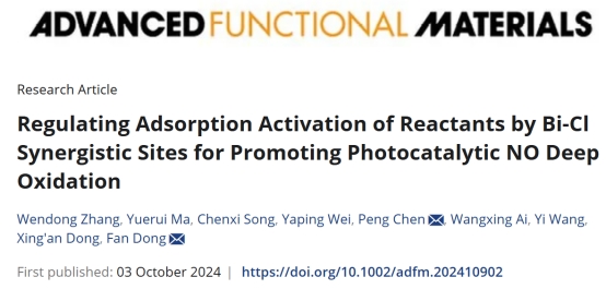 10月3日,我校关于环境污染治理的最新研究成果《Regulating adsorption activation of reactants by Bi-Cl synergistic sites for promoting photocatalytic NO deep oxidation》被国际顶级期刊《Advanced Functional Material》(SCI一区,TOP期刊,IF=18.5)在线发表。科研处张文东副研究员为第一作者,欢乐麻将
