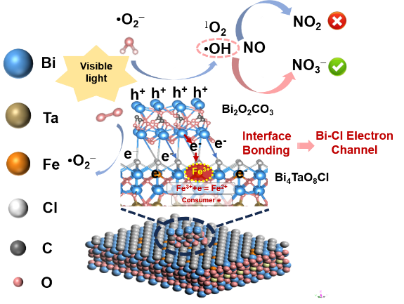 的科研团队成功研发出一种新型复合光催化剂Bi4TaO8Cl/Bi2O2CO3-Fe。他们巧妙地构建了异质结,并引入Fe³⁺作为电子受体中心,为解决NO净化难题提供了创新方案。该研究发现,Fe³⁺在光催化过程中具有“双重身份”。一方面,它能够增强界面电子转移,让光生载流子的分离效率大幅提升;另一方面,Fe³⁺可以激活表面位点的H₂O,促使具有强氧化性的羟基自由基(・OH)生成。并且,优化后的异质结光催化剂,NO转化率高达68.19%,而NO₂选择性却低至10.98%,能有效抑制NO₂的产生,将NO高效转化为稳定的硝酸盐(NO₃⁻)。电子自旋共振(ESR)和活性氧物种(ROS)猝灭实验表明,Fe³⁺驱动的电子迁移使表面空穴富集,H₂O吸附量增加,・OH生成量提升了2.76倍。强大的氧化能力使得・OH在光催化NO氧化过程中,能够有效抑制NO₂的生成,推动NO完全氧化为NO₃⁻。这项研究成果为选择性去除NO提供了新的策略,为设计环保型光催化剂提供了关键思路,在大气污染治理领域具有广阔的应用前景。未来,随着该技术的进一步发展和应用,有望为改善空气质量、打赢蓝天保卫战贡献重要力量。