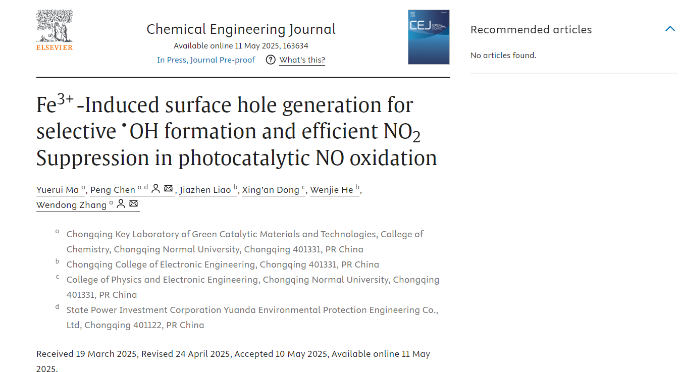 科研团队在国际高水平期刊《Chemical Engineering Journal》(SCI一区TOP,IF=13.4)在线发表了题为“Fe3+-Induced Surface Hole Generation for Selective•OH Formation and Efficient NO2Suppression in Photocatalytic NO Oxidation”的研究论文,欢乐麻将