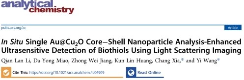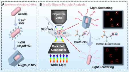 生物硫醇在人体生理过程中起着关键作用,其浓度异常会引发多种病理现象。然而,传统检测方法存在仪器昂贵、操作复杂、易受环境干扰、重复性差等问题。针对上述挑战,该工作基于暗场显微镜的高信噪比、高灵敏度和高时空分辨率,结合单颗粒分析的浓度极化效应,构建了原位单颗粒光散射分析方法,实现了对生物硫醇的超灵敏检测。该工作首先合成了一种Au@Cu2O核壳结构的纳米颗粒,利用Cu(I)与生物硫醇中巯基的特异性结合,触发Cu2O外壳瓦解崩塌,基于Au@Cu2O NPs探针散射光颜色和强度的变化,在较宽浓度范围内是实现了两种生物硫醇半胱氨酸(0.05-3 nM)和谷胱甘肽(0.1-10 nM)的高灵敏检测,展现出该方法对复杂生物样本检测的应用前景。相关成果以“In situ Single Au@Cu2O Core-Shell Nanoparticle Analysis-Enhanced Ultra-Sensitive Detection of Biothiols Using Light Scattering Imaging” 为题发表于《Analytical Chemistry》。重庆师范大学为论文唯一单位,欢乐麻将