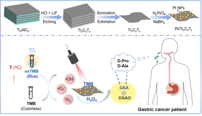 胃癌的早期诊断对提高治愈率和生存率至关重要,针对胃癌早期患者唾液中D-氨基酸(DAA)含量显著升高这一特征,开发出一种近红外光响应的Pt/Ti3C2Tx等离激元纳米探针,基于等离激元增强的过氧化物酶活性,构建了一种比色/光热双信号检测DAA的新方法。该方法应用于45例临床样本中DAA的含量检测和胃癌诊断,结果与临床诊断结论高度一致,对胃癌诊断的特异性达96.3%,阳性预测值达94.7%,准确率达97.8%。该工作不仅证实了DAA可作为胃癌及相关胃肠道癌症的有效诊断标志物,还为临床诊断提供了可靠性高、非侵入性的唾液检测新方法,避免了传统活检等有创检查给患者带来的创伤。该成果以“Detection of d-Amino Acids in Saliva for Gastric Cancer Diagnosis Using Pt/MXene Plasmonic Nanozymes”为题发表于《Analytical Chemistry》。重庆师范大学为论文第一单位,欢乐麻将