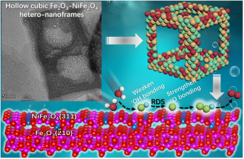 电解水析氢为缓解化石能源危机提供了一种清洁、高能量的替代方案。其过程包括两个半反应:阴极析氢反应 (HER) 和阳极析氧反应 (OER)。然而,在碱性环境下,OER受限于复杂的四电子转移过程,导致其动力学缓慢,成为制约电解水效率的主要瓶颈。为了提高碱性条件下电解水效率,该研究以Ni、Fe基普鲁士蓝类似物 (Ni-Fe-PBA) 为前驱体,通过氨水刻蚀、水热、焙烧等步骤制备了负载在N掺杂石墨烯上的中空Fe2O3-NiFe2O4异质纳米框架 (nf-NiFe2O4-NG)。该材料暴露的Fe2O3{