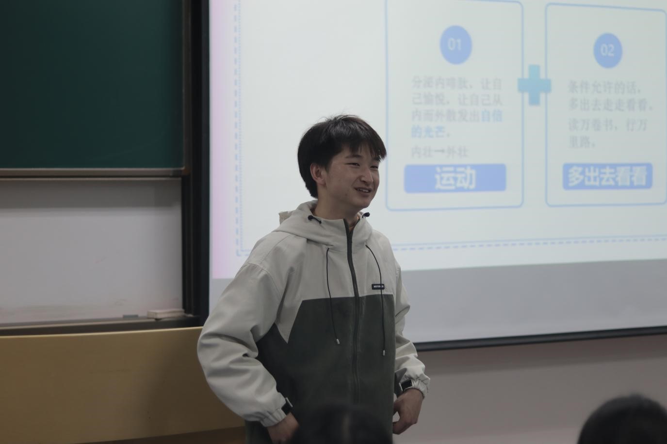然后由龚坤杰学长为同学们分享他的成长经历。首先,龚坤杰学长是一个积极乐观、充满阳光的人,那如何能成为这样的人呢?学长告诉了我们两个方法,一是坚持运动,让“内壮变成外壮”,从内而外散发自信的光芒;二是多看看外面的世界,开阔眼界,做到“读万卷书,行万里路”,只有内心强大了才能不惧外界的风雨。其次,热爱运动是他成功的一部分原因。适当的运动会让人的思维变得更加活跃,使人的心情变得更加愉悦。最后,学长为我们分享了一些四六级的准备方法和应试技巧。生活中做很多事磨练自己,那么你所做出的努力会与你的收获成正比。