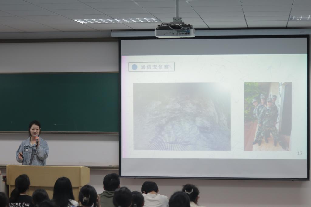 “身穿戎装无悔青春,脱下军装初心不移”。 首先由朱启廷学姐为各位同学介绍她的成长经历。朱启廷学姐在分享过程中最常说的一句话就是“不要给青春留下遗憾。”