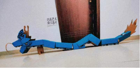 1000多份作品,同学们集思广益,发挥所长利用树叶落花制作出风格各异的作品,同时纸箱宠物也从纸箱狗升级到了纸箱龙。