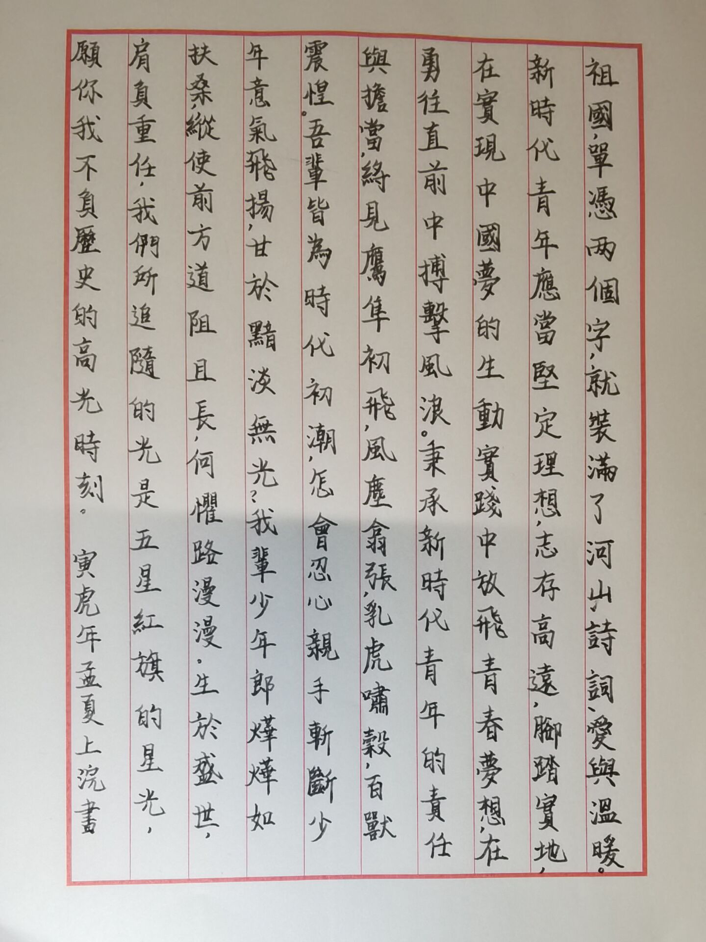 书法之美在表也在骨,同学们以书法为媒,感受红色精神,致敬党的二十大,书写青春的昂扬之姿,用文字表达着深深的爱国之情。