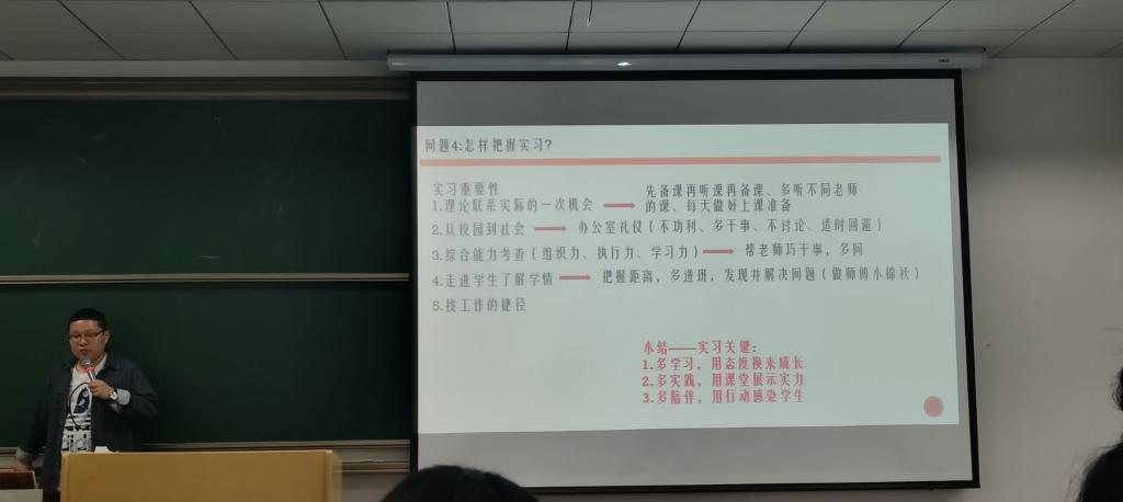 与此同时,李老师还特别强调了实习的重要性。在实习过程中同学们应该注意理论联系实际,将学到的教育学、心理学的知识运用到实际教学中。并且,实习也是走进学生、了解学生的一个好机会,只有走进真实的中学课堂,才能更好的了解当前学生的学习情况,有针对性的调整自己的教学方式,提高自己的教学能力。最后,李老师总结了把握好实习期的关键:多学习,用态度换来成长;多实践,用课堂展示实力;多陪伴,用行动感染学生。