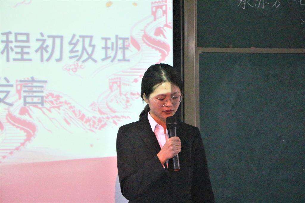 紧接着,于斌老师老师上台致辞——对第十二期青马班进行总结发言并宣布第十三期青马班正式开班。他向同学们简单介绍了青马班在大一至大二学年的学习工作安排,并且指出这门课程不仅仅是为了学习知识,更是为了提高思想觉悟与道德修养,同时也向新一期的成员提出自己的殷切期望。接下来是第十三期青马班学员代表邓遵敏同学上台发言,本次的开班仪式也在同学们热烈的掌声中落下了帷幕。
