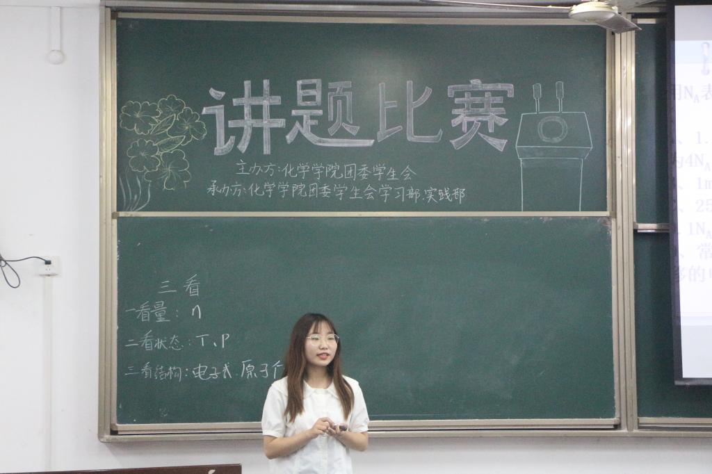 活动伊始,主持人余菲菲宣布比赛开始并宣读比赛规则,选手们按照五人一组的顺序一一进行3分钟的讲题展示。本次参赛选手的题目以及展示顺序由参赛选手事先抽签选择所得。选手们都充分展现了自己的优势,根据自己的化学知识储备量对题目进行解题思路、推导过程的讲解,并且做出了考情分析、知识拓展等。