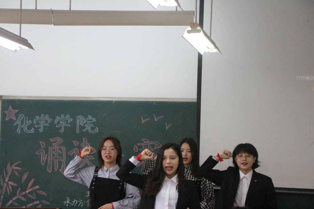 活动伊始,主持人对到场的评委和观众表示热烈的欢迎。比赛正式开始,四组团队依次上台朗诵。其中一号团队“白马非马”着装整齐,声音铿锵有力,与背景音乐浑然一体。接下来是二号团队“祖国的小红花”,她们的阵阵诵读声时而激昂,时而低沉,时而抑扬,饱含激情。然后是三号团队“传颂经典”,他们的朗诵感情饱满,慷慨激昂。最后是四号团队“破浪”,她们别出心裁地穿插歌曲在朗诵中,独特的创意赢得了观众的阵阵掌声。最后评委现场打分,为获奖团队颁发奖状,本次活动就圆满结束。