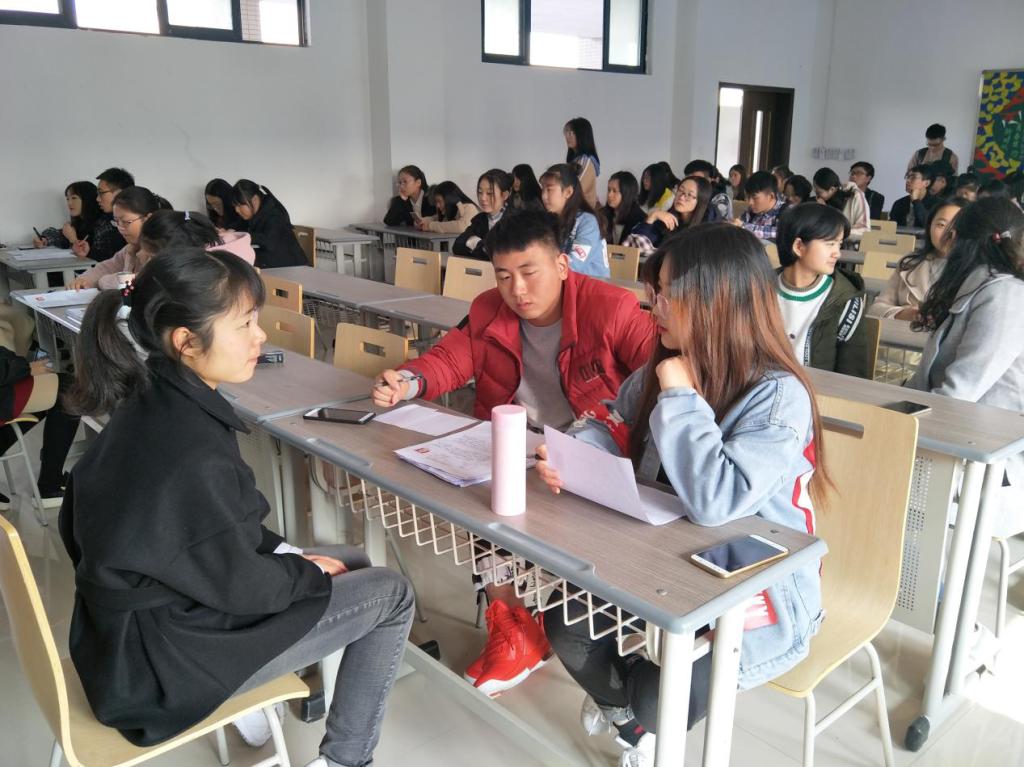 黄辉提出青年志愿者的定义是指志愿贡献个人的时间及精力,在不为任何物质报酬的情况下,为改善社会服务,促进社会进步而提供服务的人。而志愿工作具有志愿性、无偿性、公益性、组织性四大特征。接着实践部成员组织2018级同学到门外等待并迅速布置好面试场地。