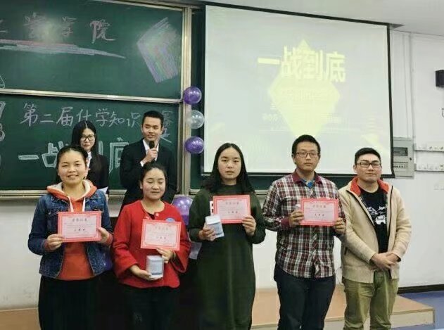 2017、2018第二届化学知识竞赛"一站到底"决赛,本次活动的嘉宾是16级辅导员陈霞老师,学生会主席唐喜,书记白艺莲;评委是第一届一站到底一等奖获得者赵松、三等奖获得者耿立珊。经过了"一站到底"的初赛,一共有十位同学进入了"一站到底"总决赛。 此次比赛的主持人为李康、王晓慧。