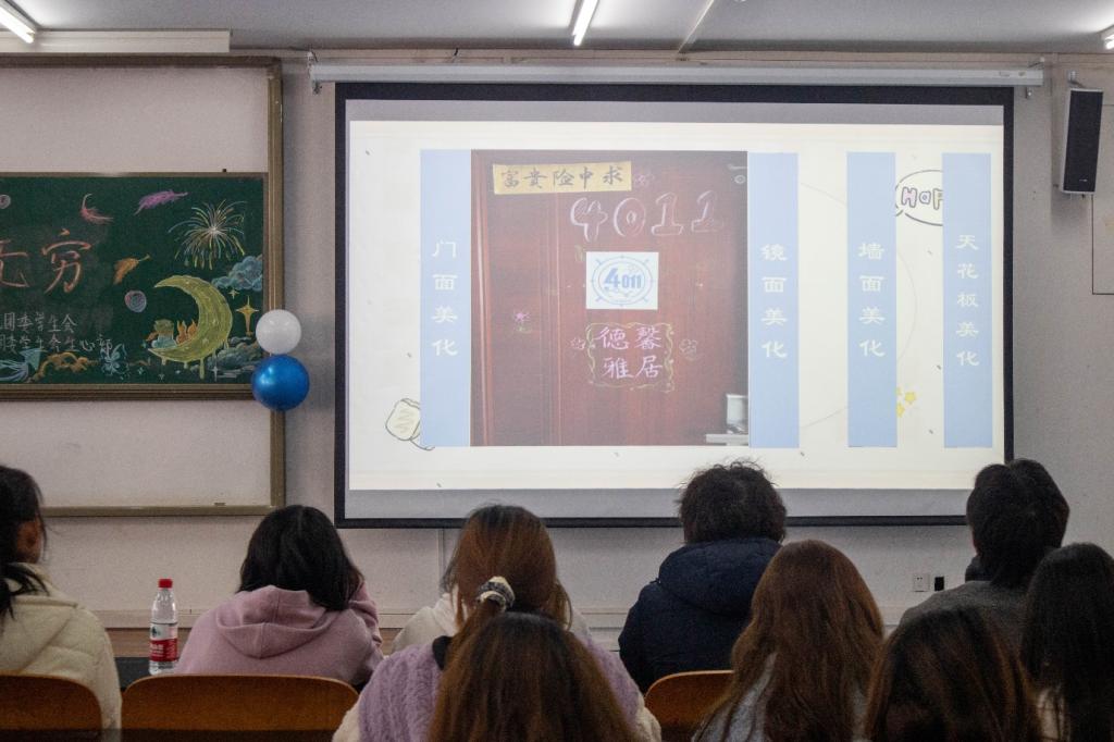 团委学生会主办、院团学会生活与心理部承办的“镁化寝室风采,魅力氢春韵无穷”寝室美化大赛决赛于励志楼2412成功举办。本次比赛出席嘉宾有24级辅导员潘登、主席团成员吕东岳和社团部主要负责人黄力峰,优秀寝室代表共计50余人参加。