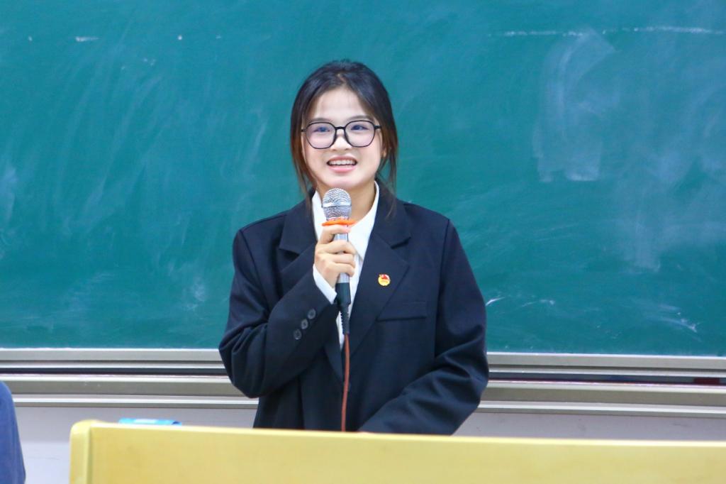 优秀学员代表胡渝浩分享自己在青马班的社会实践,如爱心家教、清明节扫墓等,同时也强调了青马工程的意义,让新成员对青马工程有了初步了解。