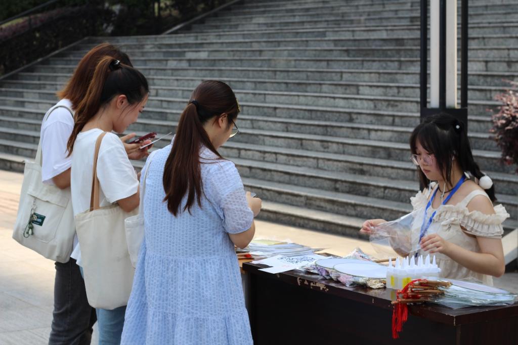 作为本次游园活动最受欢迎的项目,参与同学可在工作人员的带领下取制作团扇的材料,结合当时的真情实感并按照自己独特的想法制作出一把独一无二的团/漆扇。参与的同学都热情高涨,跃跃欲试。一时间,座位上留下了许多雕刻粘贴花团扇的身影。