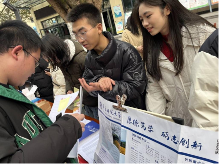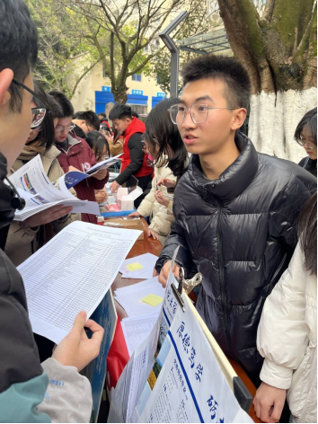 蓝玉田、张敉睿、 何科桦向同学们分发重庆师范大学宣传资料并现场为其解答相关困惑