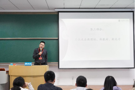 以言传身教诠释师德风范,以薪火相传砥砺从教初心。紧接着,曹老师结合自身经历,为师范生提出三点关键建议:首先要夯实专业根基,指出专业知识是教师“安身立命之本”,尤其在“新高考”背景下,必须学透学扎实,站上讲台才有底气;其次要锤炼师范技能,既要坚持练好板书基本功,也要培养沟通协调与班级管理能力;最后要主动适应基础教育改革趋势,勇于突破固有教学模式,在持续学习与创新中实现专业成长。