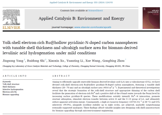 在生物质升级转化领域取得重要进展,相关成果以《Yolk-shell electron-rich Ru@hollow pyridinic-N-doped carbon nanospheres with tunable shell thickness and ultrahigh surface area for biomass-derived levulinic acid hydrogenation under mild conditions》为题在线发表于催化领域国际顶级学术期刊《Applied Catalysis B: Environment and Energy》(中科院大类一区TOP期刊,影响因子22.1),我院研究生杨京嵩为第一作者,周功兵教授为唯一通讯作者,我校为唯一署名单位。