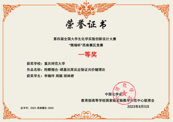 2021级学生李婉玲、胡林娇和周颖的参赛作品《羟醛缩合-硝基还原反应验证共价键理论》(指导老师:张玉龙);2021级学生胡扬莲、雷璇和龚坤杰的参赛作品《晶花盛开—表面活性剂调控尿素晶体生长及发光机理探究》(指导老师:郭文龙);2021级学生丁钰琳、杜佳音和张润的参赛作品《等离子体共振MoO2和S掺杂NiMoO4异质结的构筑及其光热分解水研究》(指导老师:田甜)在西南赛区110支参赛队伍中脱颖而出,在西南赛区总决赛中分别荣获一等奖、二等奖和三等奖,进一步展示了我校在该类赛事上的风采。