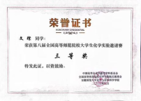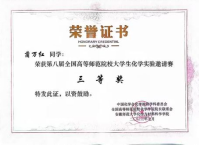 领导和指导教师的关心帮助下,学生用心筹备,力争能在比赛中发挥出最好的水平,取得好成绩。本次比赛分为实验操作和笔试两个环节。其中,实验操作部分,同学们需要在规定时间内完成一系列化学实验,分为无机和分析实验、有机和分析实验、物理化学实验三个科目,每位同学随机抽取一个科目进行比赛;笔试主要涉及中学实验操作,以及四大化学实验中的重要知识。经两天的激烈比拼,我院参赛选手刘春梅同学获得二等奖、文璨和蒲万红两位同学获得三等奖。