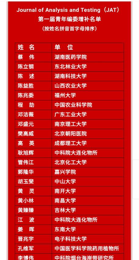 王燚教授当选Journal of Analysis and Testing(JAT)学术期刊青年编委