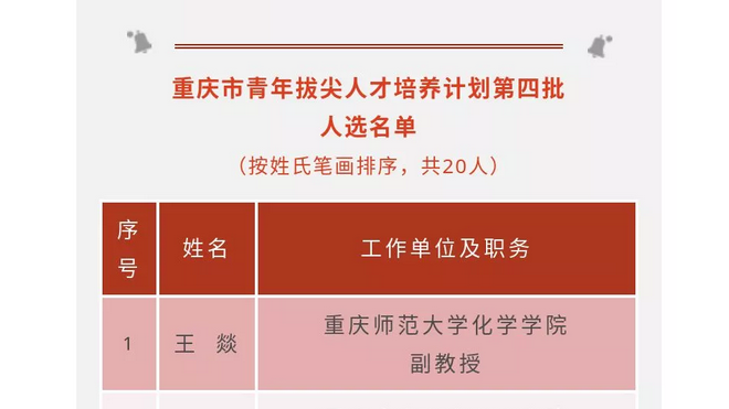 根据《关于印发重庆市高层次人才特殊支持计划5个子计划实施办法的通知》(渝委组[2013]28号)和《关于做好重庆市青年拔尖人才培养计划第四批人选申报工作的通知》(渝委组[2018]16号)规定,经评审,欢乐麻将 王燚老师入选重庆市青年拔尖人才培养计划第四批人选。