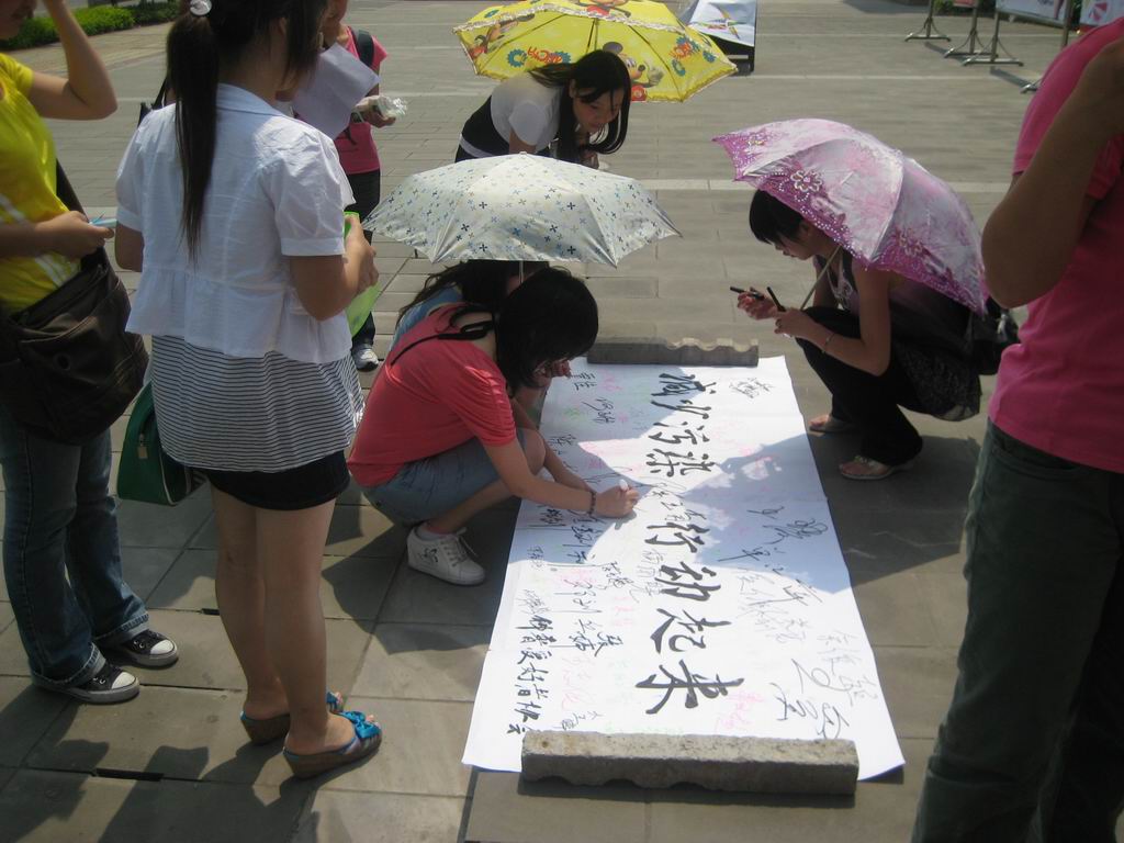 活动现场,科普协会会员为同学们宣传了绿色消费、生态人居环境等生态科普知识;开展了科普知识有奖竞猜活动;并展示了利用废旧物品改装的小制作;同时,还组织了千余名同学在题为“减少污染,行动起来”的长卷横幅上签名,以表达大家爱护环境、保护地球的愿望。