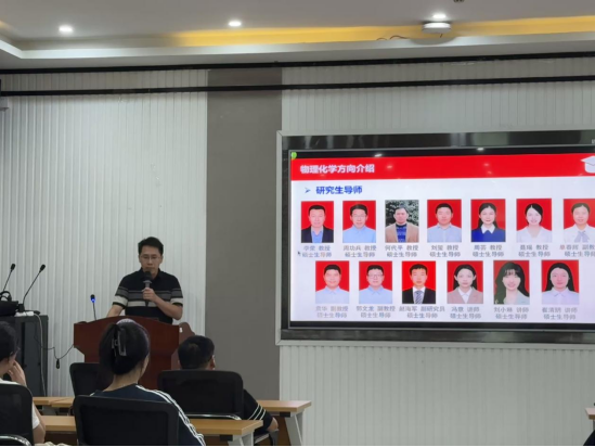 周功兵副院长对物理化学方向导师进行了介绍。导师团队在催化化学、电化学等研究领域独具特色,科研成果在国内外具有较高影响力,为学生营造了浓厚的科研氛围。