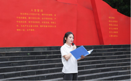 活动在雄浑激昂的《国际歌》中拉开序幕。全体党员面向宣誓墙,举起右拳,在毕业生党员代表程蕊同志的带领下庄重宣誓。举拳宣誓勇担当,青春无悔向前行。