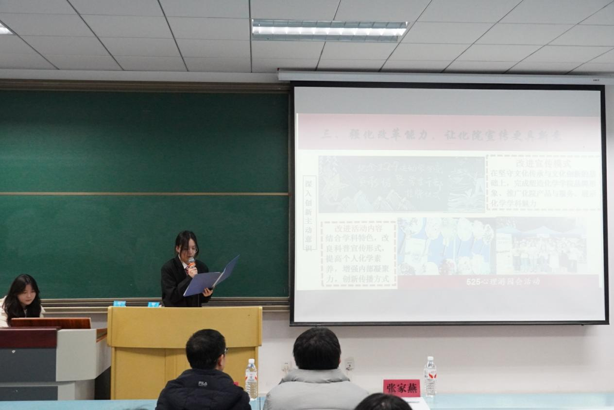 大局与同学需求:办公室、组织部扎实做好基础保障与团务管理;学习部、自律委聚焦学风建设与日常督导;宣传部与新媒体中心融合专业特色,讲好化院故事;文娱部、体育部成功举办多项文体活动,展现青春活力;生活部及素拓部着力服务同学生活与成长发展;实践部积极拓展“三下乡”、西部计划等实践平台;创新创业部努力营造科创氛围;马列部深化思想引领,扎实推进“青马工程”与理论学习教育;社团部有效激活社团活力,依托化学协会等多元平台拓展校园文化版图。各部门在展示成绩的同时,也深刻反思了工作中的短板,并提出了具体改进措施。